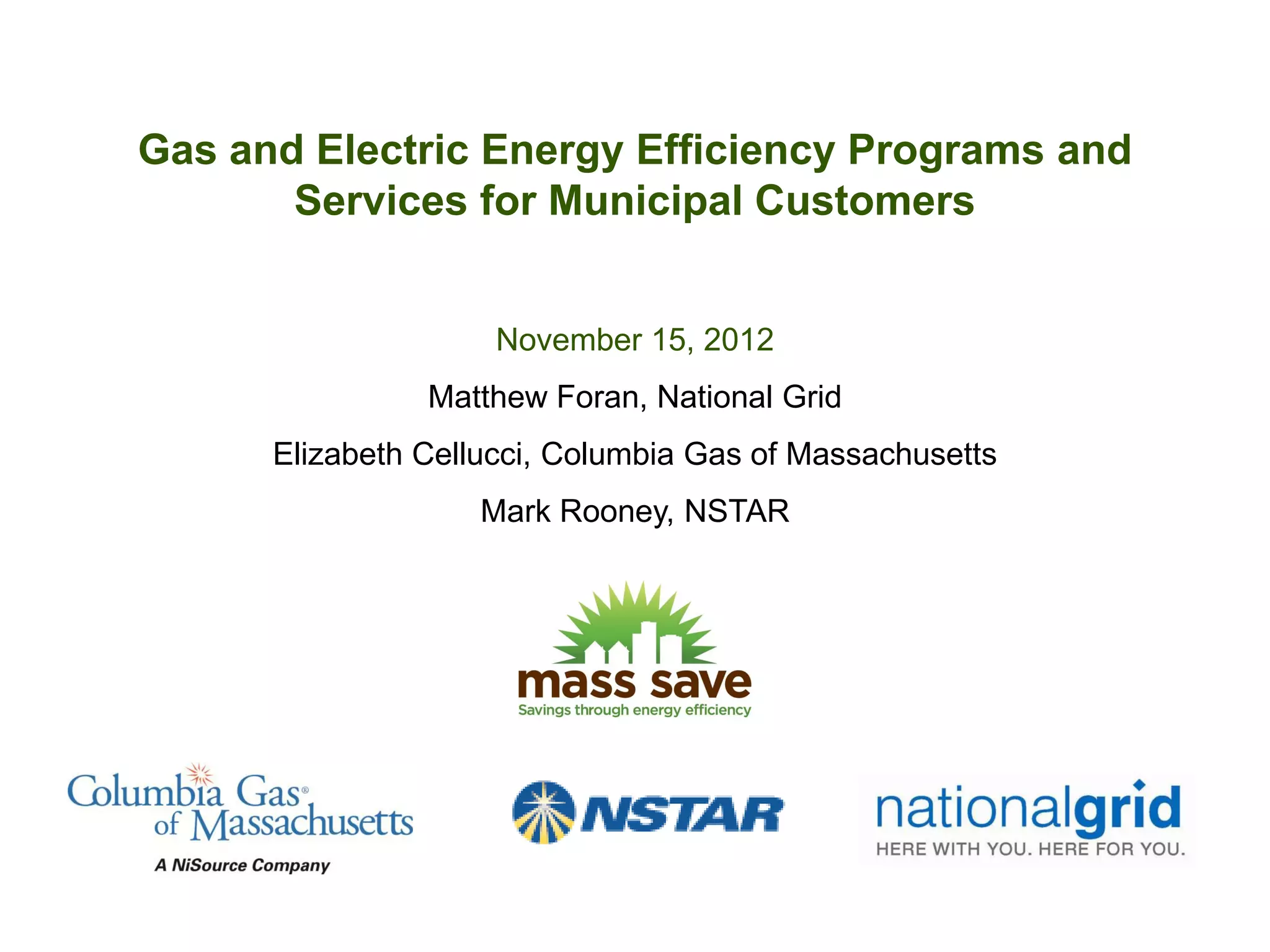 The document outlines energy efficiency programs for municipal customers in Massachusetts, initiated by the Green Communities Act of 2008 and supported by various utility companies. It details specific programs for small and large businesses, including incentives for energy efficiency improvements, technical assistance, and a streamlined application process. The document also describes pilot programs and collaboration with vendors to promote comprehensive energy efficiency solutions.