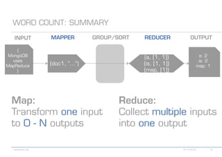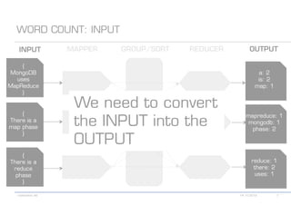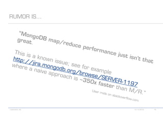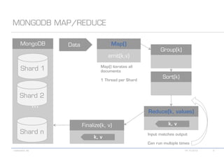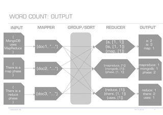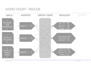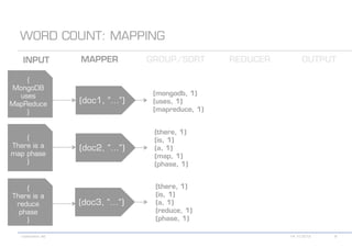 The document details various MongoDB commands and methods related to data processing, particularly focusing on querying and analyzing user data from tweets. It includes scripts for map/reduce operations and aggregation to identify users with the maximum followers. Additionally, it references the use of the MongoDB-Hadoop adapter for further data manipulation.