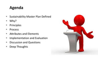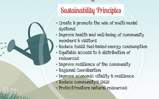 This document summarizes a presentation on developing sustainability comprehensive plans. It defines sustainability and sustainable comprehensive plans as focusing on long-term economic, environmental, social and cultural viability. The presentation recommends that such plans incorporate stakeholder engagement; establish goals and strategies through data analysis and community visioning; and include implementation plans with metrics to track progress towards goals. Case studies of sustainability plans developed for Greenfield and Lowell, MA are discussed, highlighting extensive community involvement and strategies to coordinate with other initiatives.