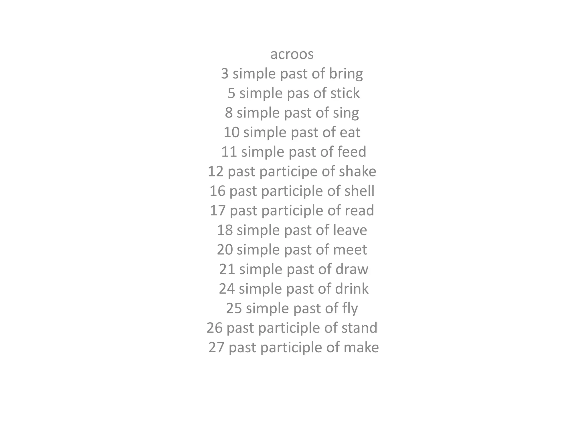 The document appears to be a list of verbs in their simple past or past participle forms. It includes common verbs like "bring", "stick", "sing", "eat", "feed", "shake", "shell", "read", "leave", "meet", "draw", "drink", "fly", "stand", and "make". There are also lists of verbs in their simple past or past participle forms below the main list, including "hurt", "choose", "be", "take", "understand", "sit", "go", "hear", "swim", "write", "go", "pay", and "win".