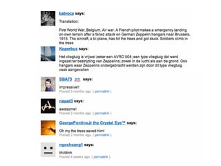 This document summarizes the MapIt1418 project, which aims to add geographic data to historical photos from World War 1 by activating communities on Flickr. The project "mashes up" Flickr photo data with mapping data from OpenStreetMap to allow people to geotag photos on a map and add their own stories. The organizers chose OpenStreetMap due to its openness, social ecosystem, and ability to be customized. They developed MapIt1418 with thorough interaction and graphic design to make mapping accessible despite the non-technical audience. The project brings together Flickr, OpenStreetMap, and other technologies to enrich cultural heritage collections and make them more discoverable.