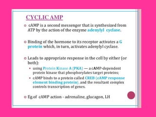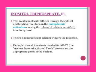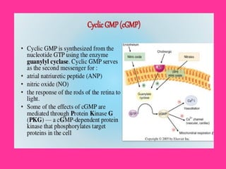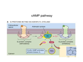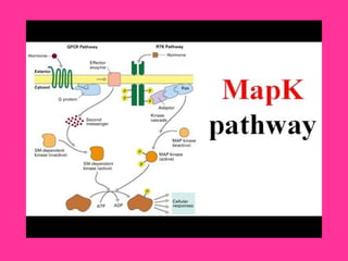 The MAPK pathway is a signal transduction pathway that responds to extracellular stimuli and regulates various cellular processes. It involves a phosphorylation cascade from MAPKKK to MAPKK to MAPK that ultimately regulates transcription factors and gene expression. Second messengers like cAMP, IP3, and calcium amplify extracellular signals and allow cross-talk between different pathways. The MAPK pathway controls processes like cell growth, division, survival, and metabolism.