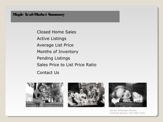 The document is a real estate market summary from Adrian Willanger, a broker at Coldwell Banker. It includes statistics on closed home sales, active listings, average list price, and months of inventory in the Maple Leaf area. Contact information is provided for Adrian Willanger at Coldwell Banker, including his phone number and email.