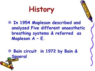 There are several types of Mapleson breathing systems classified based on the position of the reservoir bag. Mapleson A has an afferent reservoir with the bag attached to the fresh gas inlet. Mapleson D has an efferent reservoir with the bag attached to the patient outlet. Both systems allow for spontaneous or controlled ventilation but Mapleson D is more efficient due to continuous mixing of fresh gas and exhaled gases. The systems are tested for leaks and proper functioning using various occlusion and pressurization techniques.