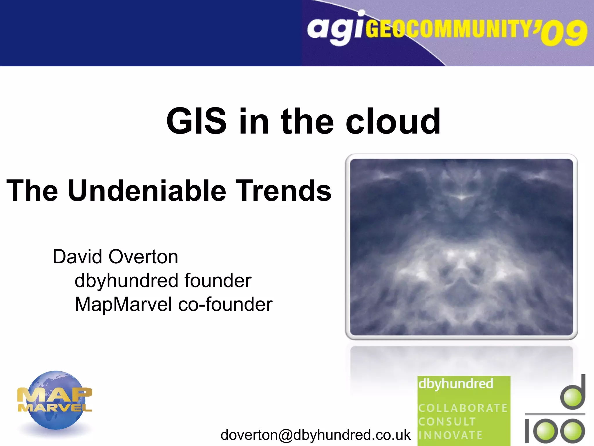 The document discusses the significant impact of cloud computing on Geographic Information Systems (GIS), highlighting its disruptive nature and how it transforms technology infrastructure, business models, and public perception. It emphasizes the benefits of service delivery over the internet and the need for the GIS market to adapt by reducing costs and improving productivity. Additionally, it introduces the MapMarvel solution for simpler data management and visualization in the cloud.