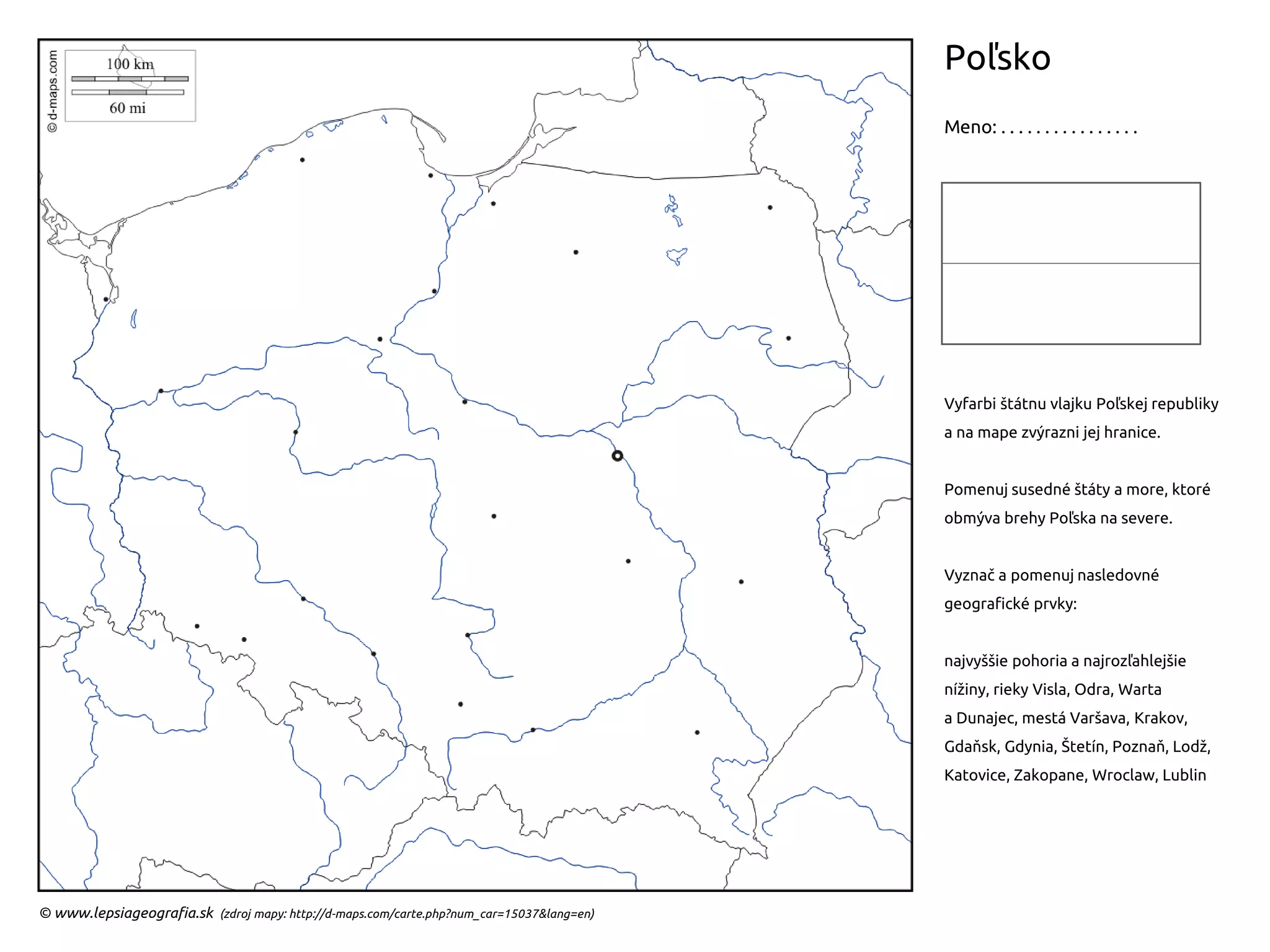 . . . . . . . . . . . . . . © www.lepsiageografia.sk (zdroj mapy: http://d-maps.com/carte.php?num_car=15037&lang=en) Vyfarbi štátnu vlajku Poľskej republiky a na mape zvýrazni jej hranice. Pomenuj susedné štáty a more, ktoré obmýva brehy Poľska na severe. Vyznač a pomenuj nasledovné geografické prvky: najvyššie pohoria a najrozľahlejšie nížiny, rieky Visla, Odra, Warta a Dunajec, mestá Varšava, Krakov, Gdaňsk, Gdynia, Štetín, Poznaň, Lodž, Katovice, Zakopane, Wroclaw, Lublin