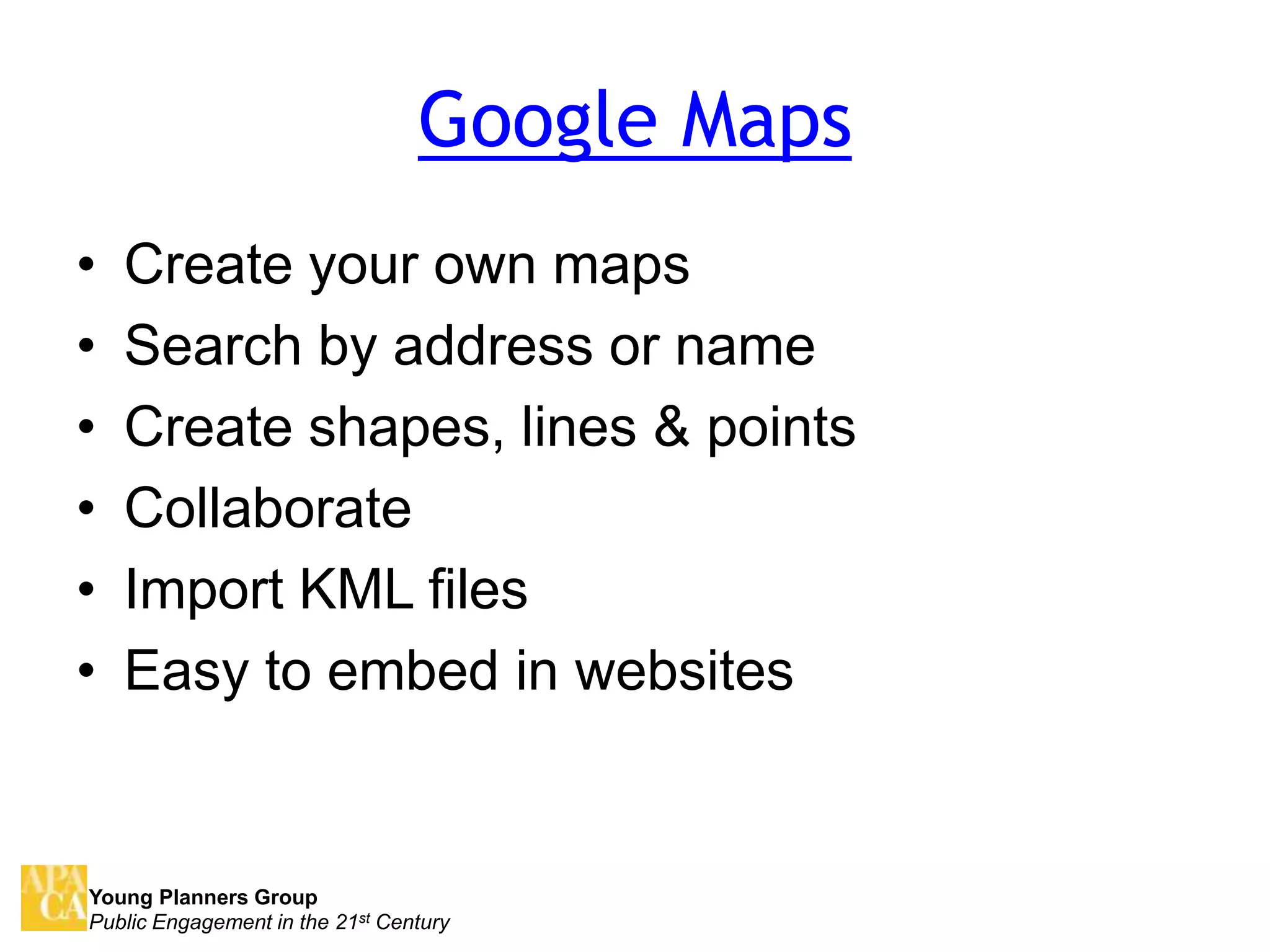 Natalie de Leon presented on using online mapping tools like Google Maps, Google Earth, BatchGeo and Scribble Maps for public engagement by planners. Google Maps allows users to create custom maps with points, lines and shapes that can be embedded on websites and collaborated on. BatchGeo helps geocode data and import to Google Maps from tables and spreadsheets. Google Earth allows creating interactive tours and posts. Scribble Maps works with Google Maps and Earth and allows sharing maps on social media. The presentation provided examples of how cities have used these tools and contacted information for Natalie de Leon.