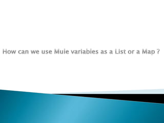 Mule ESB allows defining variables to store data, including flow and session variables. Lists and maps can be defined as Mule variables similarly to Java by using square brackets. Values can then be retrieved from the list or map using indexes or keys, and the list values can be reassigned. For example, a list variable can be set as #[{1000,100,14,1}] and values retrieved using flowVars['test'][0]. Similarly, a map can be set as #[['k2':'new', 'k3':'v3']] and values retrieved using flowVars['customMap']['k2'].
