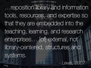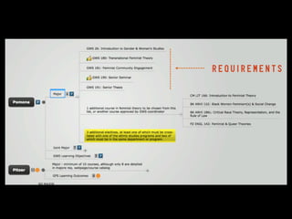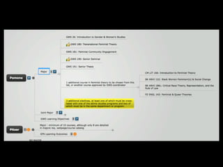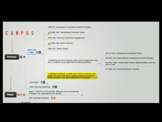The document describes mapping strategies and techniques used at the Claremont Colleges library. It discusses mapping the learner experience, contexts like the 7 Claremont campuses, curriculum mapping, and using maps for assessment, planning, community building, and visualization. A case study describes creating a map of the Environmental Analysis program that informed instruction strategies and outcomes like integrating the map into the program's website. The library then scaled up its mapping efforts using an IMLS grant.