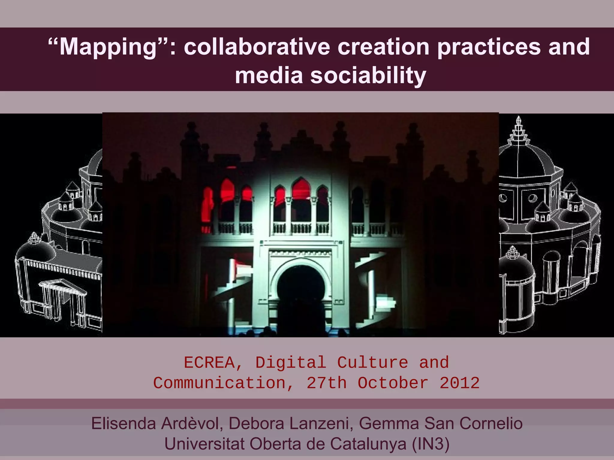 Mapping is characterized as a collaborative creative practice shaped by free software culture. The process of creating mappings involves parallel work between creative/audiovisual teams and computer engineers producing code. This iterative process involves moments of collaboration and problem solving. The members of Telenoika organize flexible work teams around projects while sustaining themselves through paid work for institutions alongside personal projects. For them, creative practices and digital media are constitutive of mapping as a collaborative practice requiring sharing through open software.