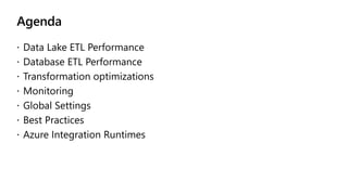 This document discusses optimizing performance for data flows in Azure Data Factory. It provides sample timing results for various scenarios and recommends settings to improve performance. Some best practices include using memory optimized Azure integration runtimes, maintaining current partitioning, scaling virtual cores, and optimizing transformations and sources/sinks. The document also covers monitoring flows to identify bottlenecks and global settings that affect performance.