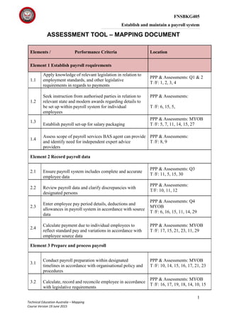 This document maps the performance criteria and skills of a course for establishing and maintaining a payroll system to assessment tools. It outlines the key elements of setting up payroll requirements according to legislation, recording payroll data, preparing and processing payroll, handling payroll inquiries, and maintaining payroll records. Skills like reading, writing, oral communication, numeracy, and digital literacy are incorporated to effectively establish and manage an organization's payroll system.