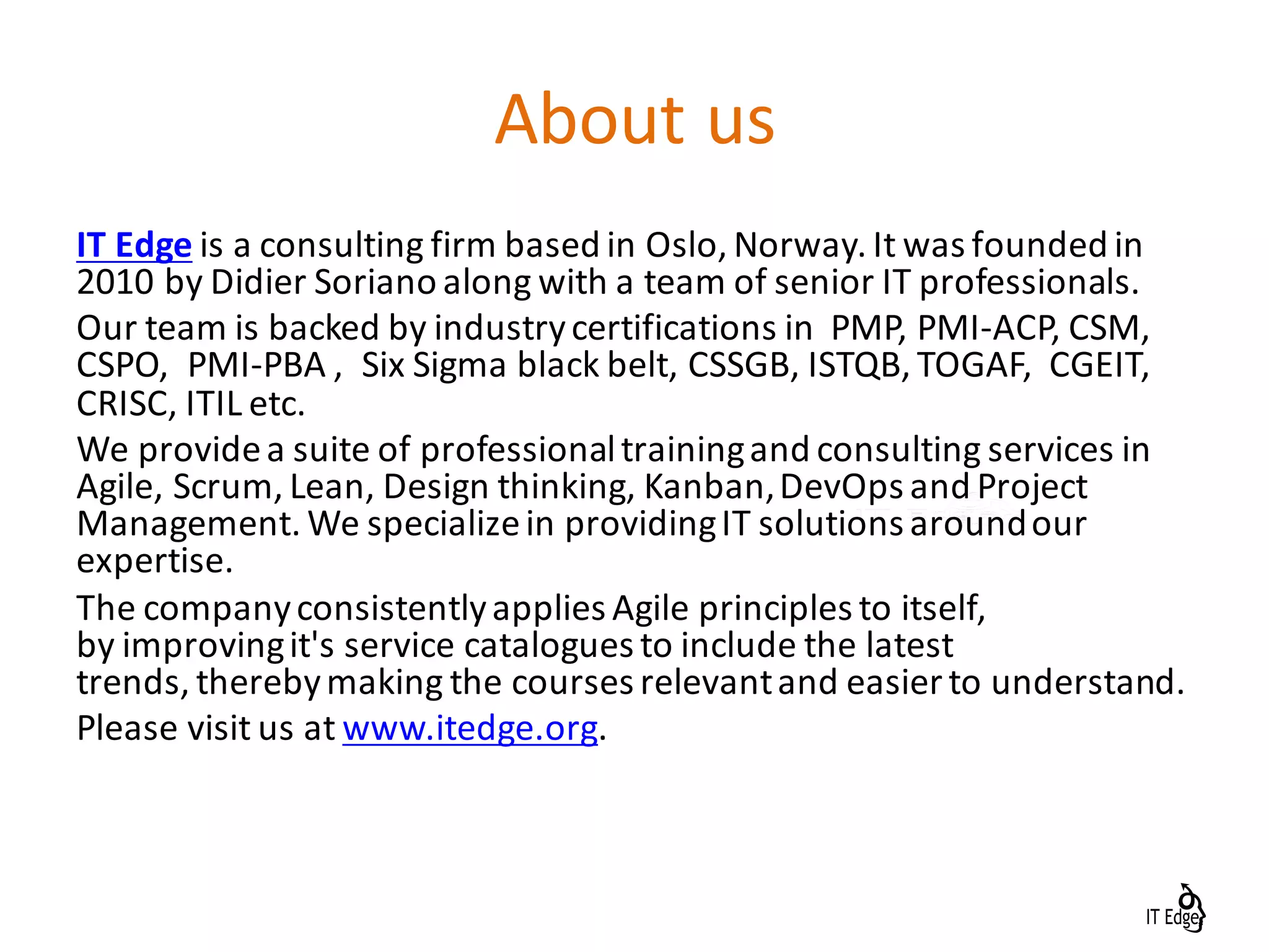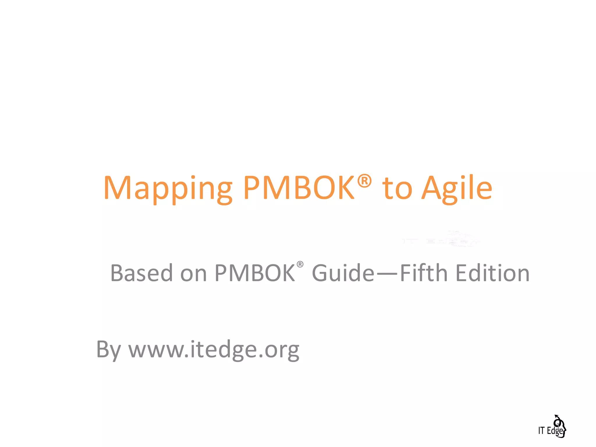 This document provides a mapping of the Project Management Body of Knowledge (PMBOK) processes to Agile methodologies. It describes an Agile consulting firm called IT Edge based in Oslo, Norway that was founded in 2010. The document maps each of the 13 PMBOK knowledge areas and associated processes to analogous Agile practices like iteration planning, time boxing, daily stand-ups and tracking work in progress. It also provides brief descriptions of how quality, communication, documentation and risk management are approached in Agile.