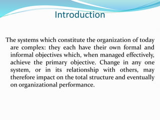 This document discusses various diagramming techniques that can be used to analyze organizational change. It begins by explaining that organizations are complex systems composed of interrelated subsystems and components. Diagramming tools can help define, analyze, and manipulate these systems to better understand how a change might impact them. Several specific diagramming techniques are described, including input/output diagrams, flow diagrams, relationship maps, systems maps, influence charts, and multiple cause diagrams. The document emphasizes that managing complex change requires a multidisciplinary approach involving multiple analytical techniques in addition to diagramming. It also introduces an Intervention Strategy Model (ISM) as a structured process for analyzing and implementing change through definition, evaluation, and implementation phases.