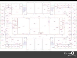 The document discusses how the Geospatial Research Lab at Rowan University supports the Department of Geography & Environment through research projects, computer lab management, and paid internships for students. It provides an overview of the GIS curriculum and programs at Rowan, including an approved Bachelor of Science in GIS. It describes how student efforts have expanded the GIS database and their involvement in various facets of work. Examples are provided of interactive web maps created by students, including an interior spaces project and space finder tool for event scheduling. The benefits of student GIS workers are outlined, and ideas to improve tools and disseminate campus information using GIS are presented.