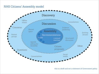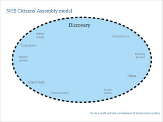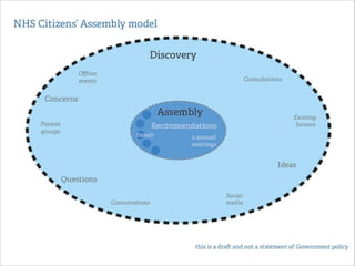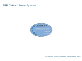 This document summarizes a workshop to map out the existing participation structures within the NHS system in England in order to understand how a new program called NHS Citizen can best operate within that system. The workshop covered introducing participants to the NHS system and network analysis, testing different types of organizations within the system, identifying relationships between organizations, starting to map the system, and next steps.