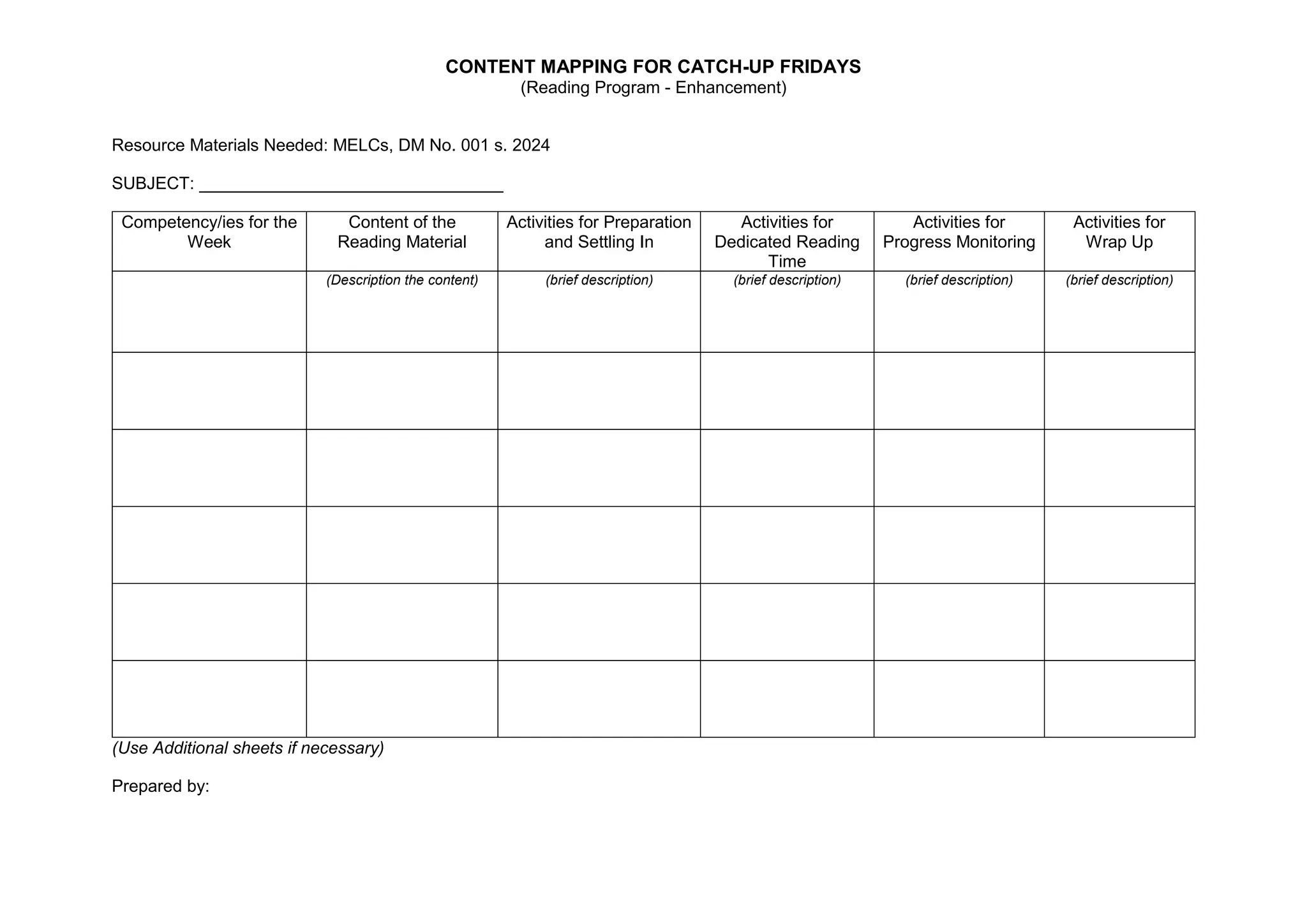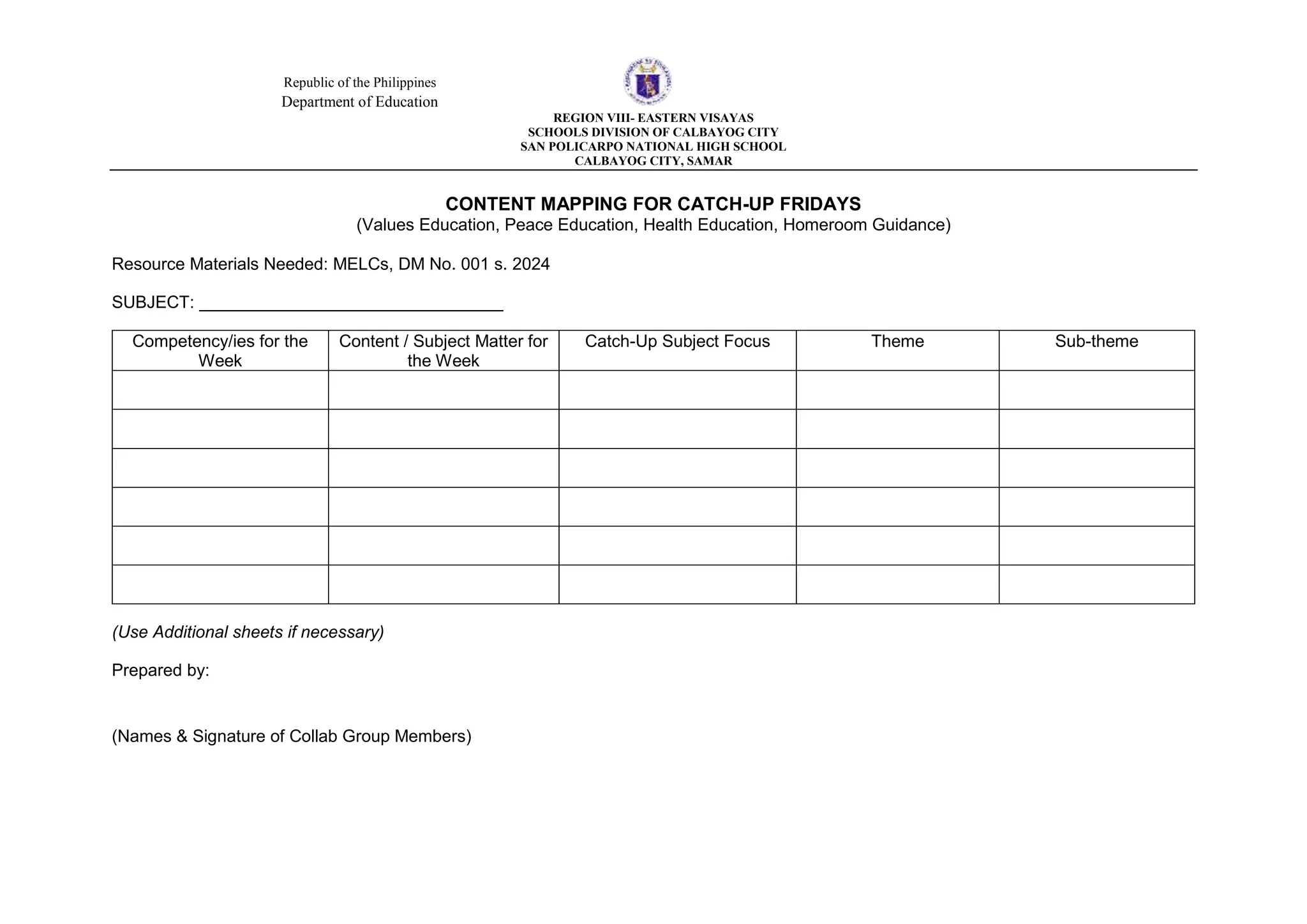 This document contains content mapping templates for catch-up Fridays at the San Policarpio National High School in Calbayog City, Samar, Philippines. The templates provide guidelines for mapping out competencies, content, activities and target skills for catch-up sessions in values education, peace education, health education, homeroom guidance, reading enhancement and reading intervention. The templates require filling in details such as competencies, content, target reading skills, and descriptions of pre, during and post activities. They are to be completed by collaborative groups and submitted.