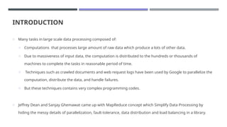 The document discusses MapReduce, a programming model developed by Jeffrey Dean and Sanjay Ghemawat to simplify data processing on large clusters, enabling automatic parallelization, fault tolerance, and data distribution. It introduces Hadoop as an open-source framework utilizing MapReduce for distributed processing and highlights its architecture, advantages, and ecosystem components like HDFS and YARN. The document also covers the execution flow, performance optimization, and use cases for MapReduce in large-scale data tasks.