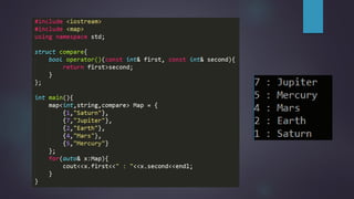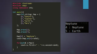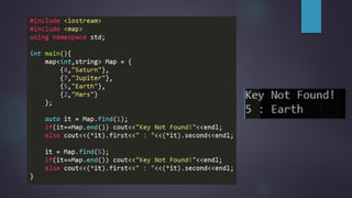 The document discusses two standard template library containers for storing key-value pairs: unordered_map and map. Unordered_map uses a hash table to provide fast lookup of elements in average O(1) time, but the elements are in random order. Map uses a binary search tree to provide O(logN) lookup time and stores elements in sorted order. Both support insertion, erasure, and lookup of elements using similar functions but have different underlying implementations and time complexities.
