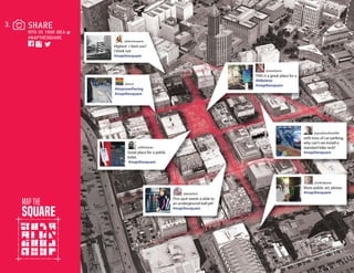 The Map the Square project was an interactive art installation and digital mapping project that invited the public to provide input on how to improve the built environment in Pioneer Square, Seattle. Over 200 tags were placed by the public at 8 kiosks and 3 parking day stalls to identify locations needing change. The tags and photos were added to an online map to create a permanent record of public input to guide future development in the neighborhood.