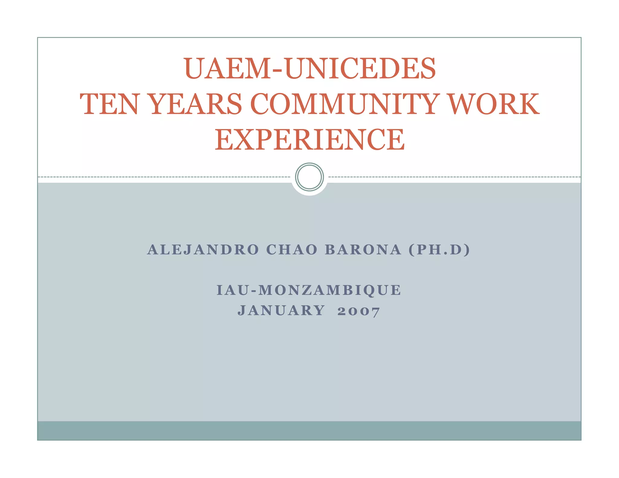 This document summarizes the experience of Alejandro Chao Barona with the UAEM-UNICEDES program over 10 years. It outlines the principles of the university and UNICEDES program, including being an interdisciplinary center for educational and social development with international links. It describes the facilities in Temixco and Tetela del Volcan and programs involving knowledge interchange, identity/health feasts, books, radio programs, and working with older community members. Opportunities and challenges are discussed, and conclusions call for defining the university's role, increasing resources for research training, and preparing teams for respectful community interaction.
