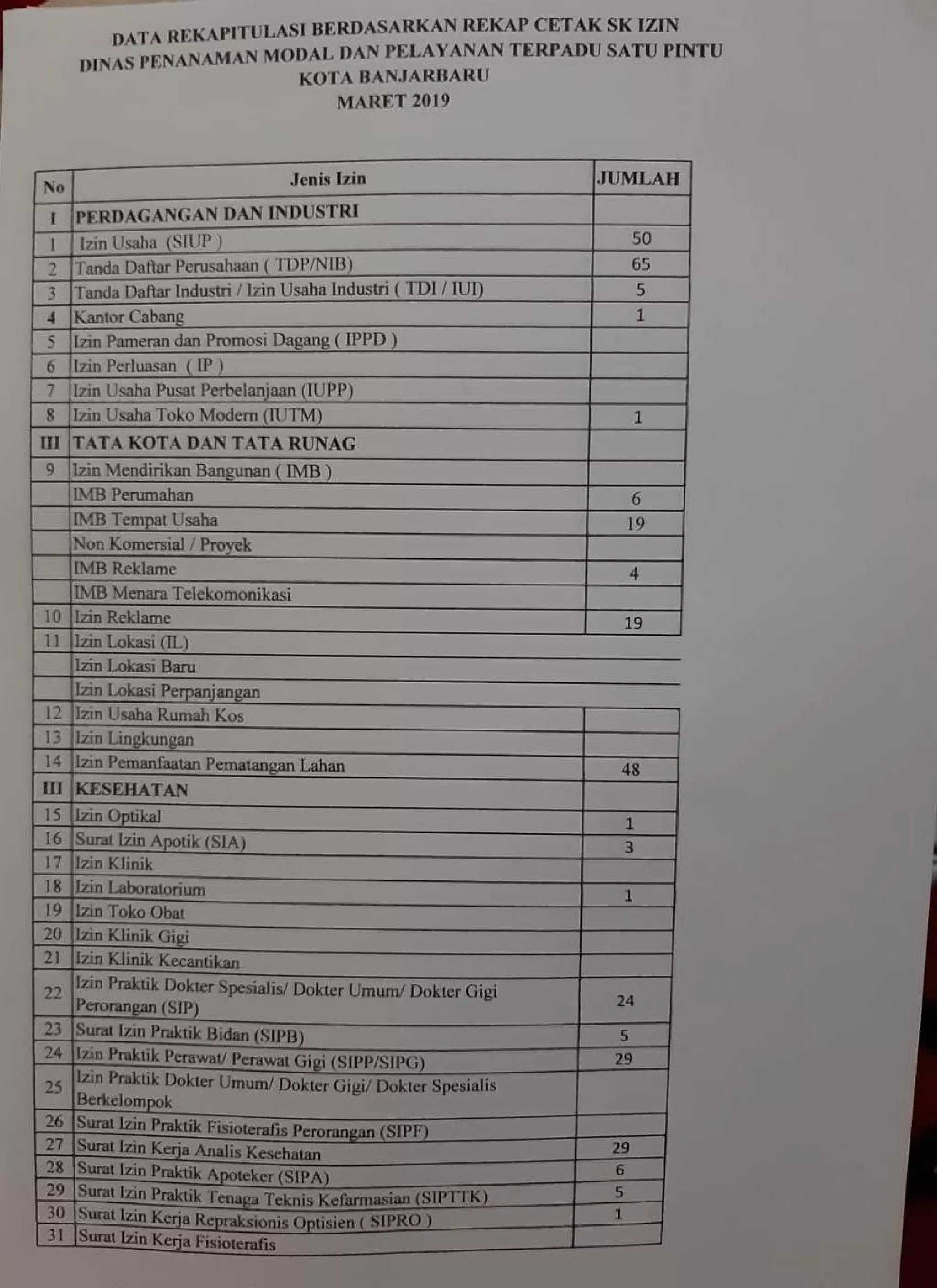 Rekapitulasi jumlah perizinan tahun 2017