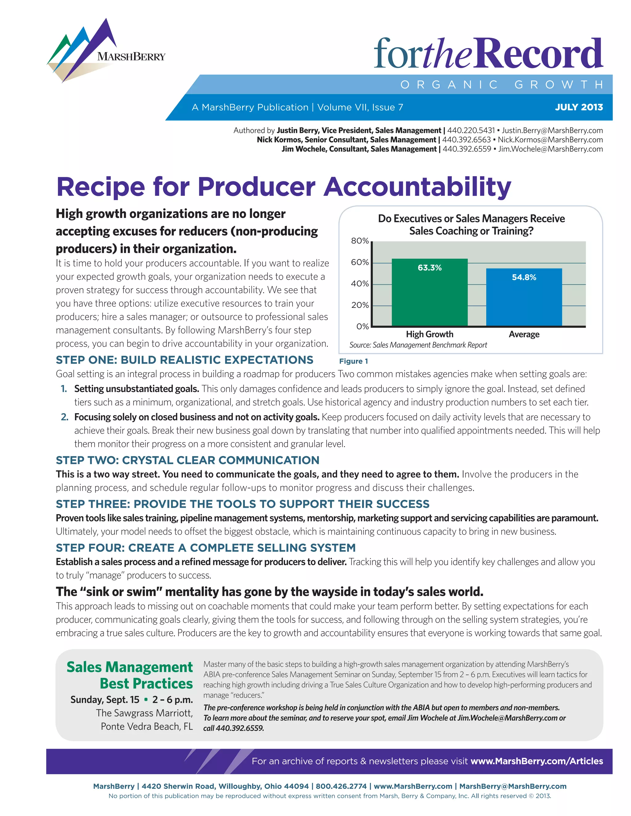 The document outlines a four step process for holding producers accountable in order to meet organizational growth goals. Step one is to build realistic goals by setting defined tiers based on historical data. Step two is clear communication of goals through involvement in planning and regular check-ins. Step three is providing tools to support success like training and systems. Step four is establishing a sales process and message for producers to follow. By setting expectations, communicating goals, providing tools and processes, organizations can embrace a true sales culture of accountability needed for growth.