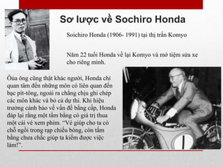 Soichiro Honda (1906-1991) là người sáng lập công ty Honda, bắt đầu từ việc sửa chữa xe đạp và phát triển thành công ty sản xuất xe máy lớn trên thế giới. Honda gia nhập thị trường Việt Nam vào năm 1996 với sự hợp tác của các đối tác Nhật Bản và Thái Lan, nhằm mang lại an toàn và hạnh phúc cho người tiêu dùng. Công ty đã đạt được thành công lớn với doanh số xe máy tăng trưởng mạnh, trở thành một trong những thị trường xe máy lớn nhất thế giới.
