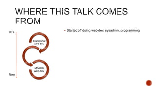 The document summarizes a talk focused on web application security at a Sydney meetup, highlighting the evolution of web development and common security vulnerabilities developers face today. It discusses the complexity of modern flaws compared to textbook examples and emphasizes the importance of defensive coding practices and thorough security assessments. The speaker shares insights on mitigating risks and stresses the need for continuous education and awareness in web security, supported by various resources and event participation.