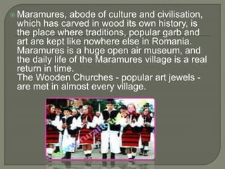 Maramures, Romania is known for preserving traditional culture, particularly in wood carving and architecture. Eight of the region's wooden churches are UNESCO World Heritage sites, including the tallest wooden building in the world. Traditional crafts like weaving and woodworking are still practiced today. The Merry Cemetery in Sapanta contains hundreds of wooden crosses decorated with poems about the deceased. Maramures culture is celebrated throughout the year in festivals and events featuring local music, dancing, and distinctive garb.