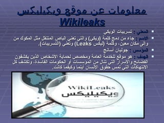ويكيليكس هو موقع تسريبات أنشأه جوليان أسانج في يوليو 2007، يهدف إلى حماية الأشخاص الذين يكشفون الفساد والانتهاكات حول العالم. يتيح الموقع نشر الوثائق السرية من مصادر متنوعة, وقد أصبح معروفًا بتسريبات مهمة تتعلق بالحروب وحقوق الإنسان، مما يجعل منه واحدًا من أكبر مواقع التسريبات في التاريخ. تعرض الموقع لانتقادات وقضايا قانونية على خلفية نشاطاته، لكنه يستمر في العمل على نشر المعلومات الحساسة وإثارة النقاشات حول الشفافية والمساءلة.