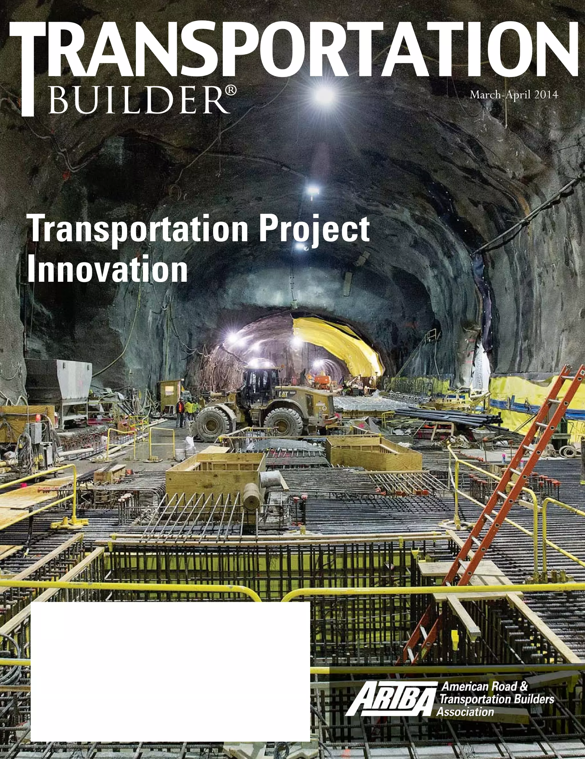 This document is the March-April 2014 issue of TransportationBuilder, the official publication of the American Road & Transportation Builders Association (ARTBA). The issue focuses on transportation project innovation, featuring an overview of innovative construction techniques being used and case studies submitted by ARTBA members. It also discusses the upcoming federal issues program and fly-in to advocate for solutions to the looming Highway Trust Fund crisis. The president of ARTBA explains in his column why engagement is needed from the transportation construction industry for Congress to prioritize this issue.