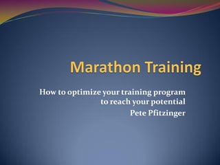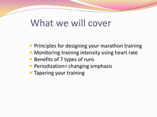 The document outlines strategies for optimizing a marathon training program, focusing on principles of training design, monitoring intensity with heart rate, and the benefits of various run types. It emphasizes periodization, tapering, and the careful balance between training intensity and recovery to enhance performance while minimizing injury risks. Key components include specific types of runs, gradual mileage increases, and effective tapering strategies leading up to race day.