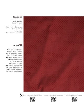 The document lists the coaches and players of the Marauders basketball team, along with their upcoming 2012 schedule. It also lists attributes like belief, determination, awareness, leadership, passion, and dedication that are important for winning as a Marauder. The schedule shows home and away games against teams like Rio Hondo, Victor Valley, San Bernardino Valley, Barstow, Desert, Chaffey, and Mt. San Jacinto from January through February.