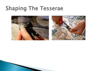 This document provides information about mosaic training conducted in Pakistan. It discusses the initial challenges in obtaining raw materials and learning the techniques. It then describes a three-month training facilitated by Mirza Furqan Baig that helped participants learn mesh-mounted mosaic techniques. However, more training was still needed to produce marketable products. The document lists several mosaic training manuals produced and identifies a competent trainer used by different organizations. It provides photos of sample mosaic products and images of materials and tools used in mosaic making.