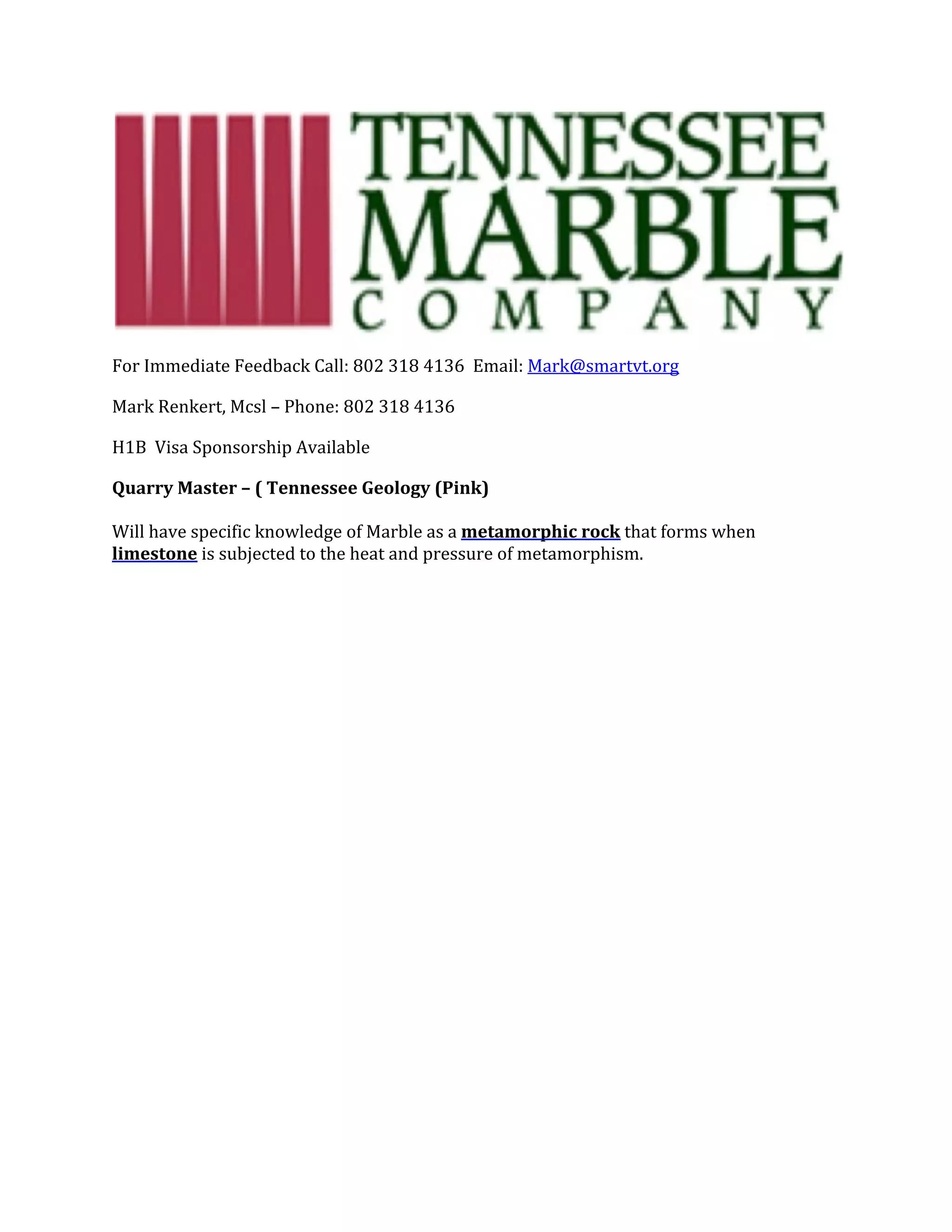 This document is listing the requirements for a Quarry Master position at a historic marble quarry in Tennessee. The ideal candidate will have extensive knowledge of geology, specifically the formation of marble through metamorphism. They will also have experience operating and maintaining quarry equipment and managing a quarry staff. The candidate must understand the unique characteristics of operating the only Tennessee Pink quarry in the world.