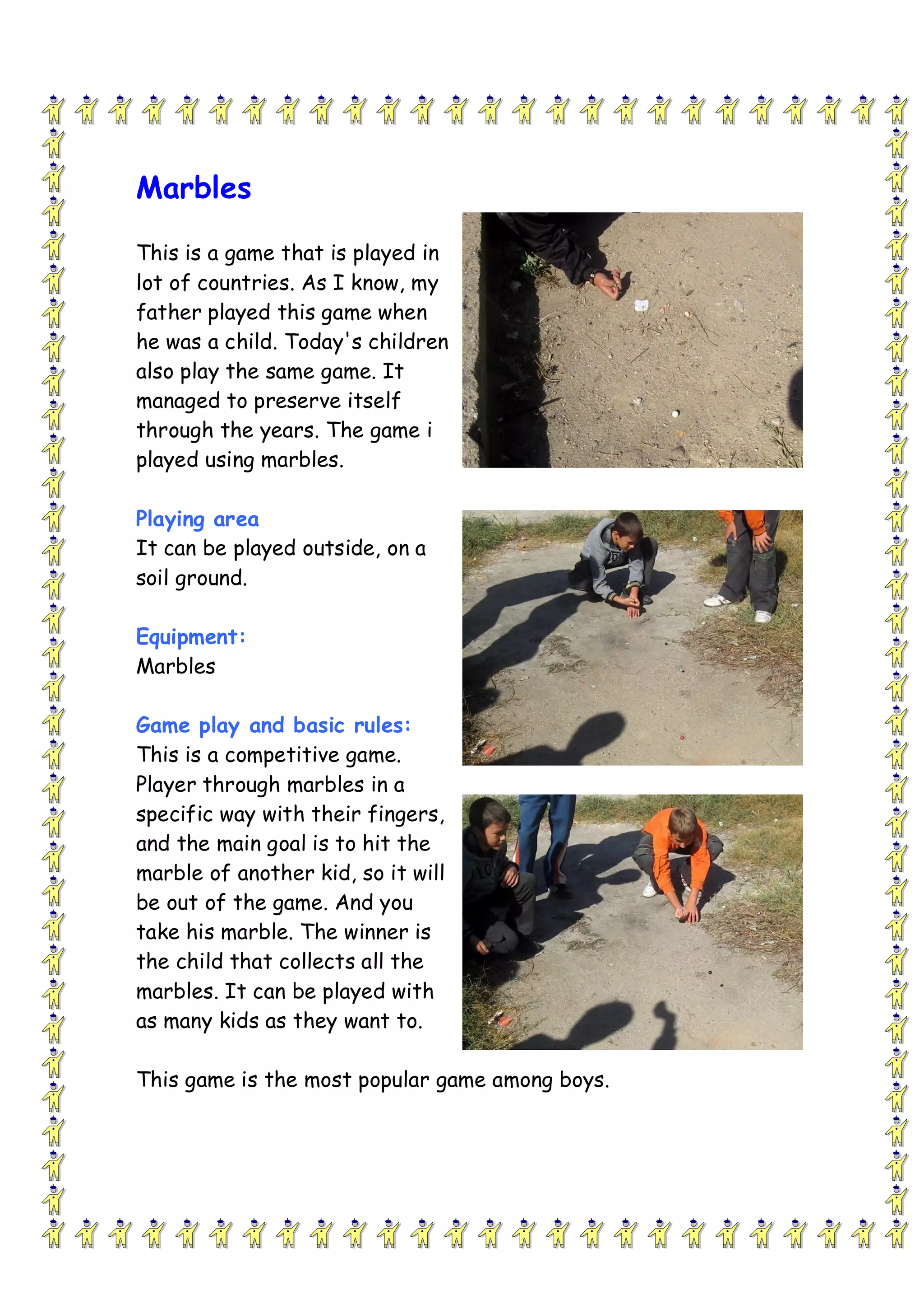 This document describes the classic children's game of marbles, where players take turns flicking marbles with their fingers to hit and capture other players' marbles, with the goal of collecting all marbles to win. Marbles has been played by children for generations in many countries using only marbles as equipment on an outdoor dirt surface. It remains a simple yet engaging competitive game for kids.