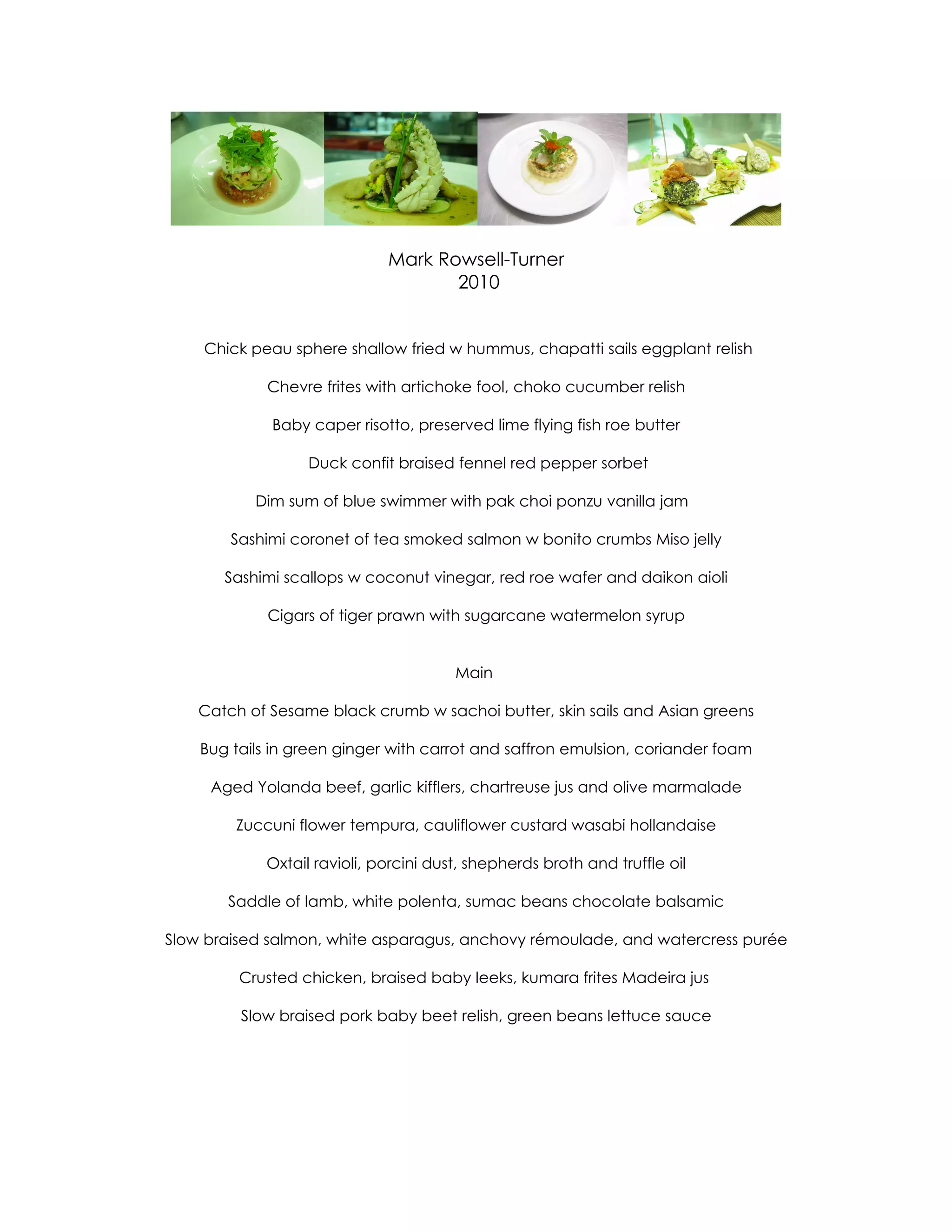 This document appears to be a menu listing appetizers and main courses with creative descriptions. The appetizers include items like chickpea spheres with hummus and chapati, baby caper risotto with preserved lime flying fish roe butter, and sashimi of tea smoked salmon. The main courses provide globally influenced dishes such as catch of the day with Asian flavors, aged beef with olive marmalade, and slow braised salmon with white asparagus. Desserts are not included on the menu.