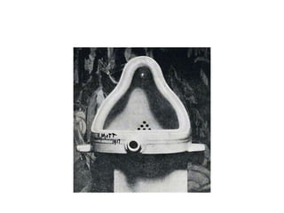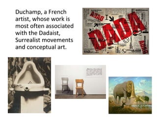 Marcel Duchamp was a highly influential French artist born in 1887 who worked in Dadaism and conceptual art. He helped define revolutionary developments in painting and sculpture in the early 20th century. Duchamp rejected "retinal art" meant solely for visual pleasure and sought to put art back in service of the mind. His works like Fountain and L.H.O.O.Q. challenged definitions of art by taking everyday objects and placing them in galleries. Duchamp created miniatures of his works in the Box in a Valise and influenced generations of artists through his experimentation and questioning of art.