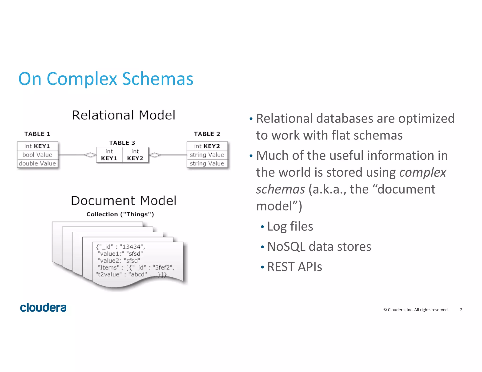 The document discusses how relational databases are optimized for flat schemas but much real-world data uses complex schemas. It advocates for using intentional complex schemas to simplify analytic workloads. It describes how SQL engines like Impala can handle complex schemas through extensions like supporting nested data types of struct, map, and array to allow full SQL expressiveness over nested data. Columnar storage is also important for efficiently processing complex schemas.