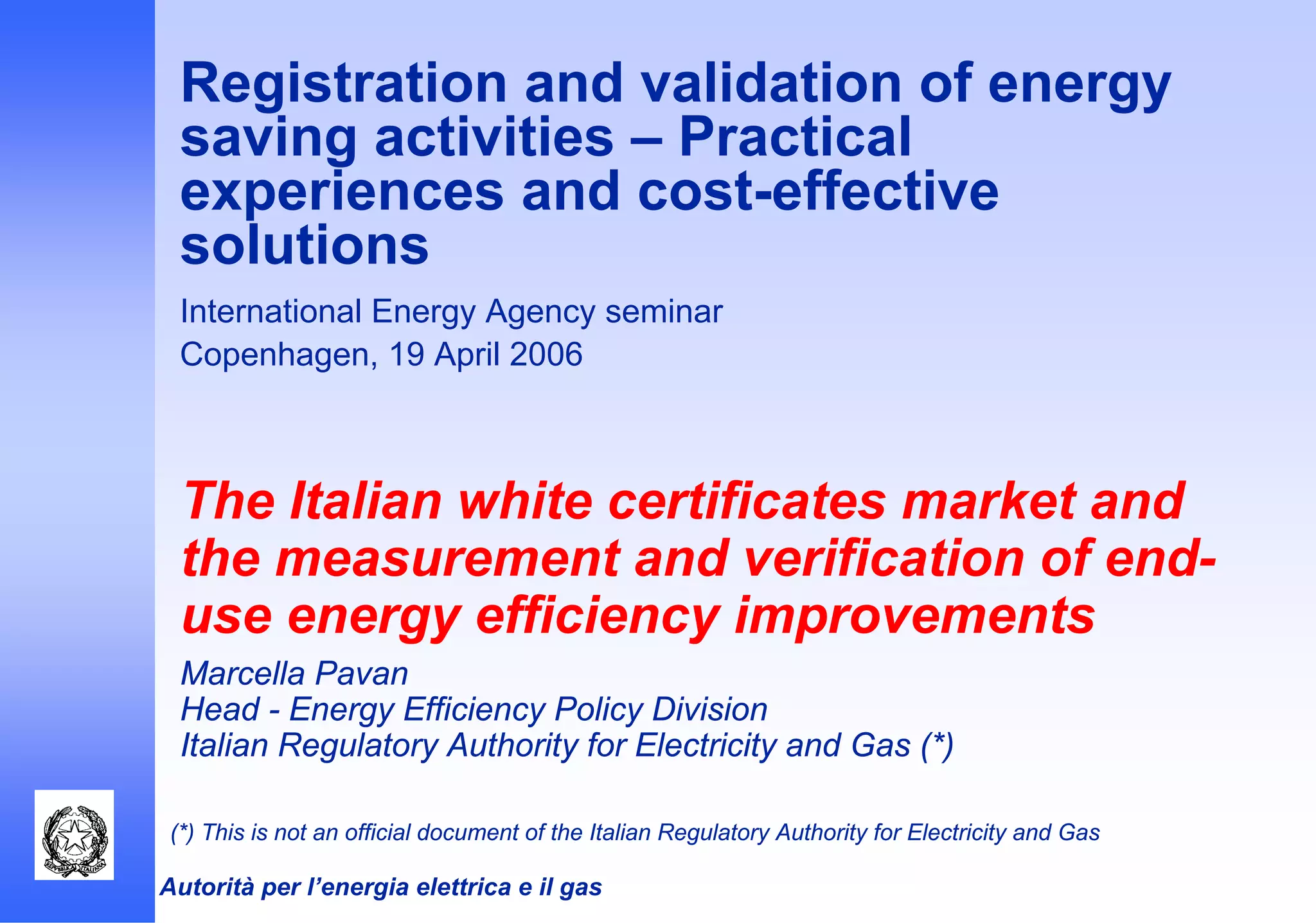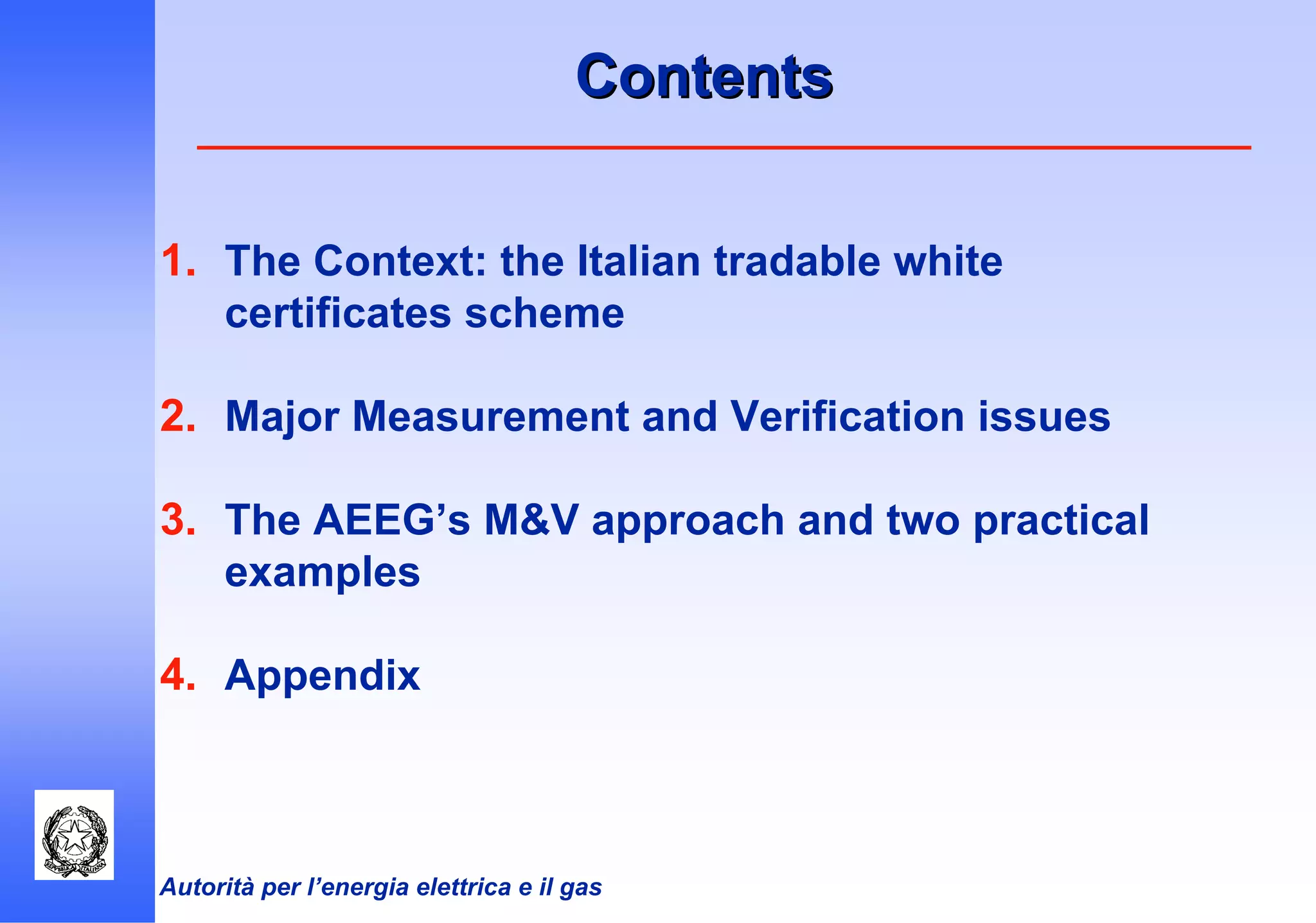 The document discusses the Italian tradable white certificates scheme aimed at promoting energy efficiency through a regulated market. It emphasizes the importance of measurement and verification (M&V) mechanisms for ensuring that energy savings are real and quantifiable, highlighting various M&V approaches and associated technical challenges. Additionally, the document outlines the regulatory framework, types of eligible projects, and the roles of the AEEG in administering and monitoring the scheme.