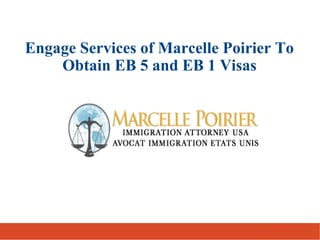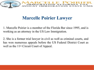 Marcelle Poirier is an immigration lawyer located in Miami, Florida who offers services for various visa types including EB-1, EB-5 investor visas, and other employment and family-based visas. She has over 20 years of experience in immigration law and boasts a high success rate of over 98% for obtaining visas. Her law firm provides affordable services for visas such as EB-1 for outstanding professionals, EB-5 investor visas requiring $1 million investment and job creation, and helps clients obtain citizenship and permanent residency.