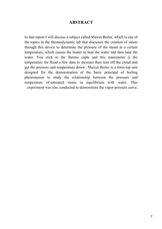 1. The document discusses a Marcet boiler experiment conducted by a student to study the relationship between steam pressure and temperature.