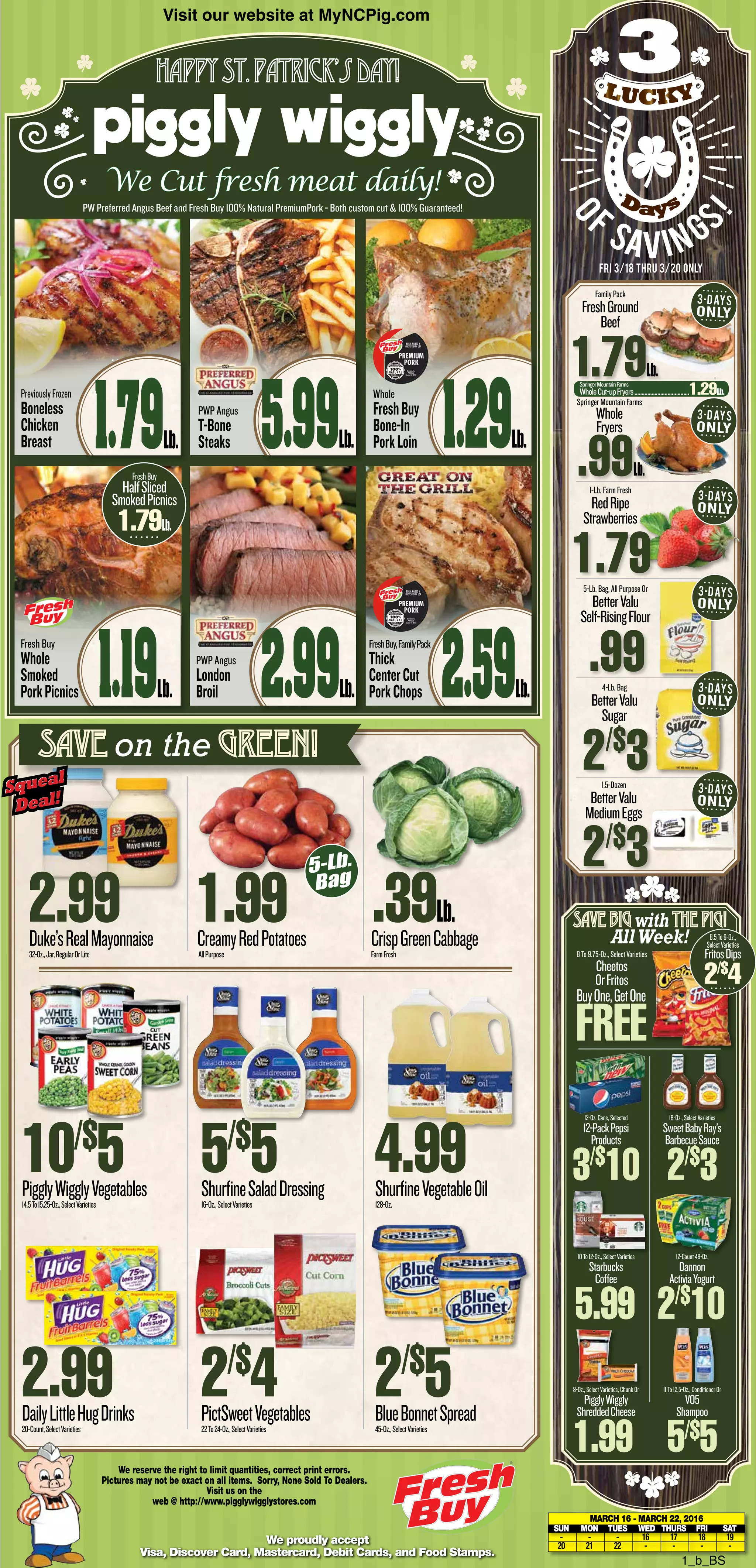 This document is an advertisement for Piggly Wiggly grocery store. It lists many fresh meats, produce, and other grocery items for sale along with their prices. It promotes sales and specials on items like pork, strawberries, chicken, and catfish. The store cuts fresh meat daily and accepts various payment methods.