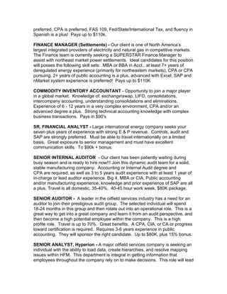 The document lists various job opportunities in the oil and gas sector for positions including management roles for subsea engineers, treasurers, controllers, and various finance-related roles. Ideal qualifications generally include experience in the industry, relevant degrees, and certifications such as CPA or MBA. Pay ranges for these positions typically span from $60k to $200k, depending on the role and level of experience.