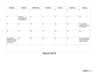 The document is a calendar for March 2013 that outlines the production schedule for a film. It includes drafting the soundtrack and sound effects on the 5th, completing the film poster layout by the 17th, and doing a film pitch and receiving feedback about the idea on the 31st.