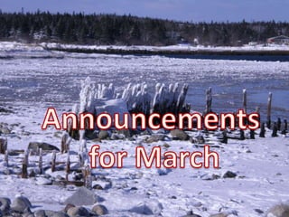 The document announces several upcoming church events including a potluck meal on March 16th, a Discovery Zone Children's Choir concert on March 25th, and Passion Week services from March 25th-29th at various local churches. It also provides the nursing home visitation schedule for Bay Side Nursing Home and Roseway Nursing Home. Finally, it provides contact information for Pastor Pat Cook and details about the monthly Grace Night event for communicating love and responding to community needs.