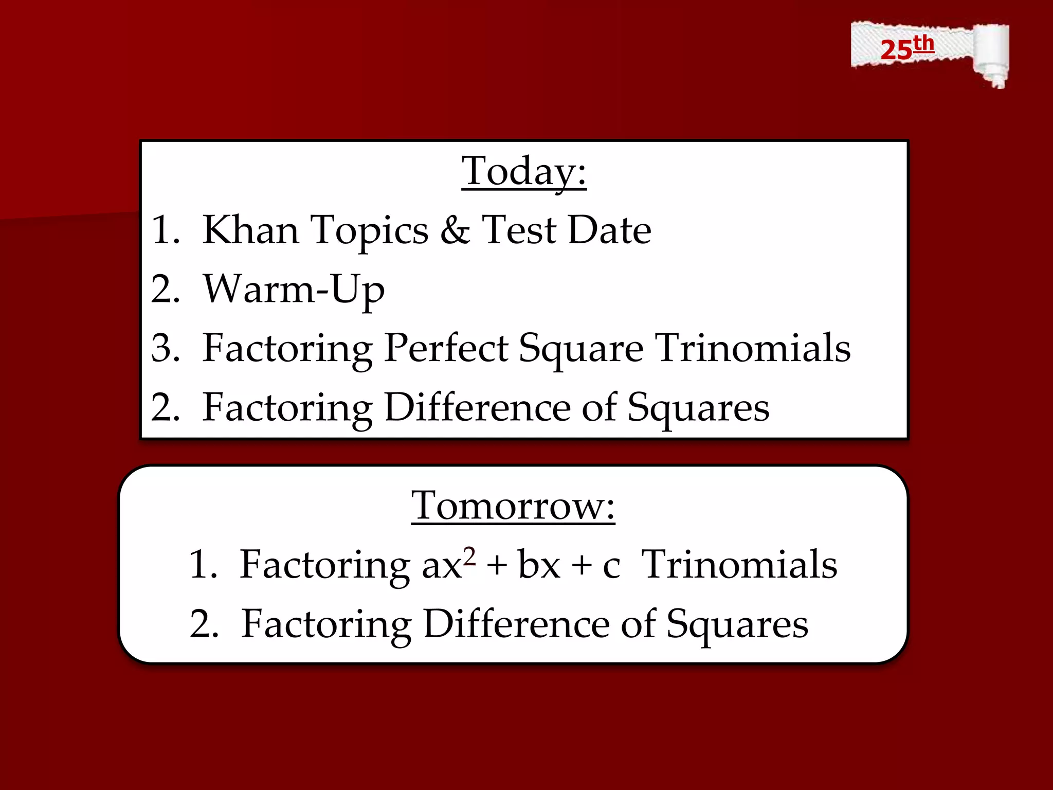 The document provides an agenda and notes for a math class focusing on factoring polynomials. Tomorrow's lesson will cover factoring trinomials and the difference of squares, while today covers perfect square trinomials, a warm-up on factoring practice, and a review of techniques for factoring completely. It also lists Khan Academy topics and an upcoming factoring test on specific methods.