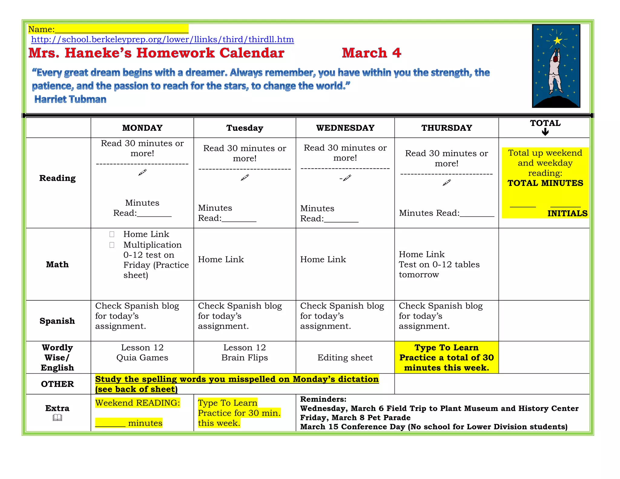 The document is a weekly homework and reading log for a third grade student. It includes assignments for reading, math, Spanish, and other subjects for each day of the week. The student is asked to track their reading minutes each weekday and weekend and calculate a total at the bottom. Various spelling and vocabulary words are also included along with suggestions for practicing and reviewing them throughout the week.