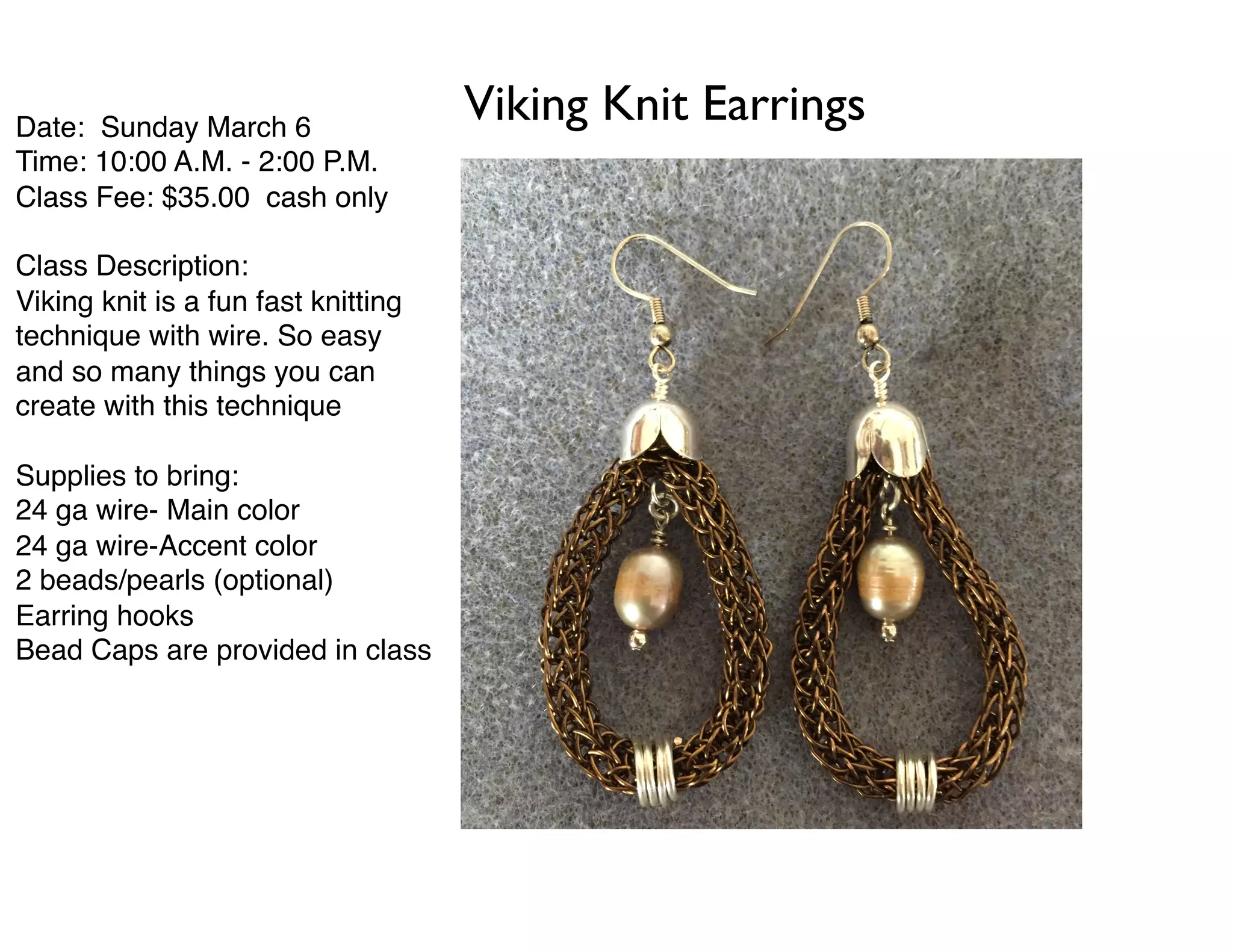 This document contains information about three craft classes: 1) A viking knit earring class on March 6th for $35 cash only, where students will learn the viking knit technique using wire to create earrings and supplies are provided. 2) A soldered china pendant class on March 13th for $55 cash which includes all materials, where students will make pendants using metal stamps and solder without many tools. 3) A half cut tila bead bracelet class on February 21st for $20 cash only, where students will learn to make a soft and pretty beaded bracelet using various beads and a needle.